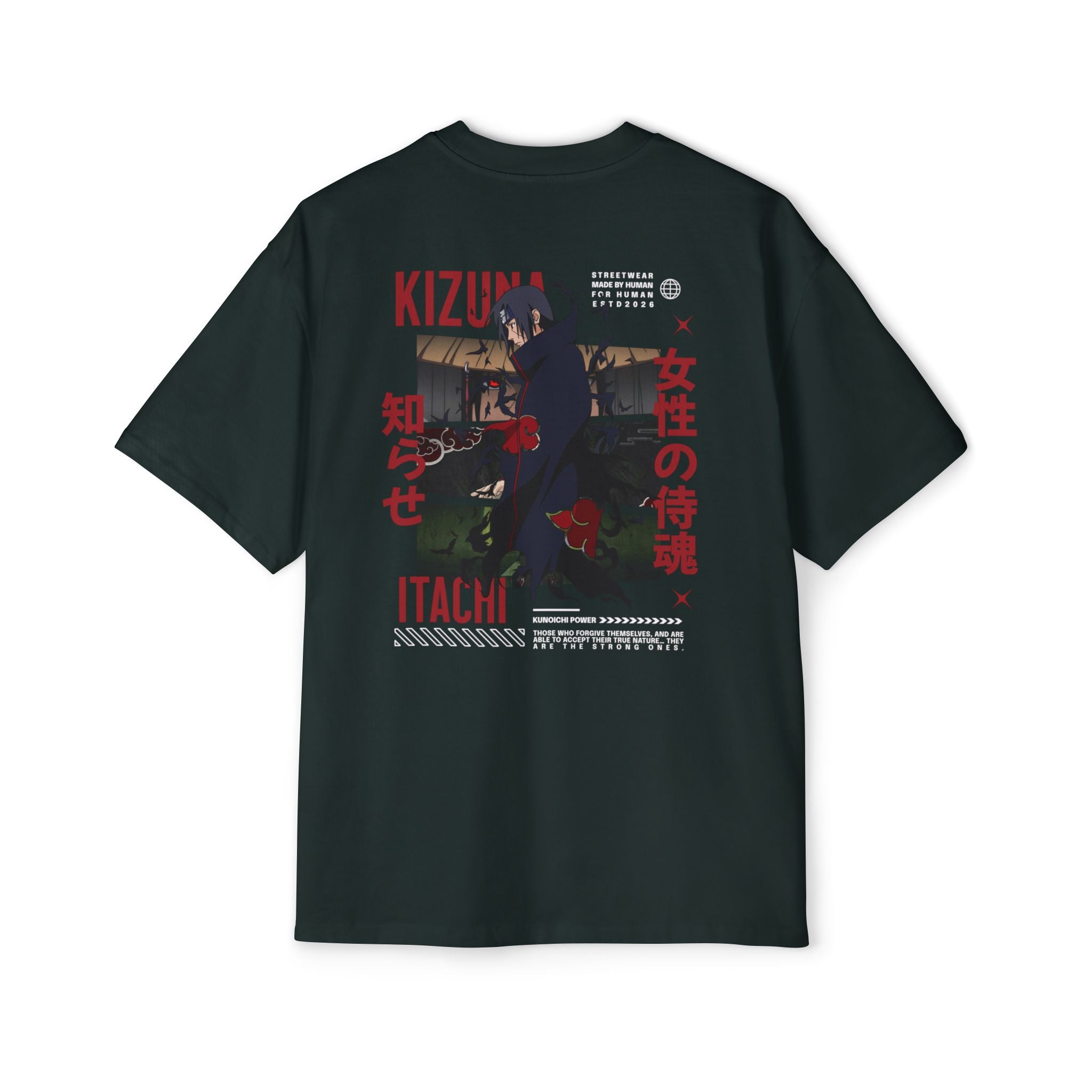 This oversized tee carries a moody, streetwise energy — a roomy silhouette that lets art and attitude breathe. Washed black fabric holds a compact front chest print and a larger, cinematic panel on the back: a vivid collage of red typography, Japanese characters, and a lone figure framed by shadow and neon. It feels like a midnight walk through back alleys: confident, slightly defiant, and quietly expressive. Wear it with tapered cargo pants and weathered sneakers for layered, urban evenings or drape it over a long-sleeve for cooler nights. The heavy-weight cotton gives structure to the shape, so the design stays bold and the tee keeps its presence through many wears.